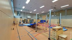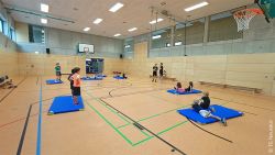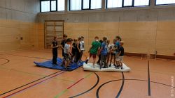 Nicht alle Inhalte wurden in beiden Wochen angeboten. So fand nur in der ersten Sportwoche ein Ausflug in die Südschule statt. Dort hatte die Trampolinabteilung drei große Trampoline aufgebaut und alle (einschließlich der Betreuer*innen) durften das Springen üben! Hier war viel Konzentration und Körperspannung gefragt.