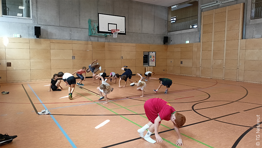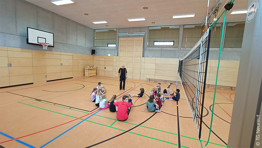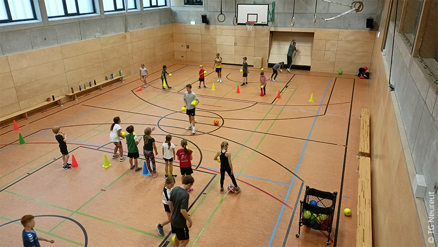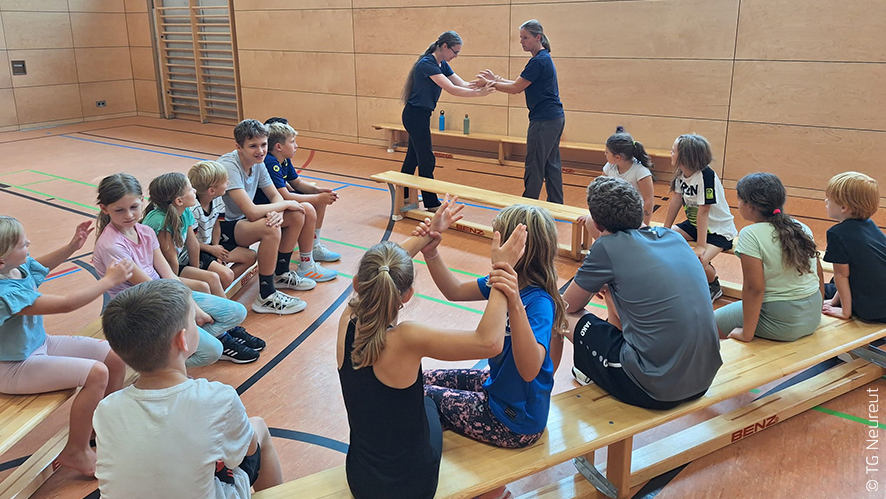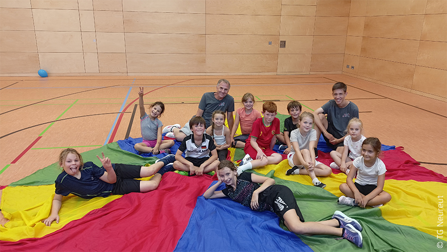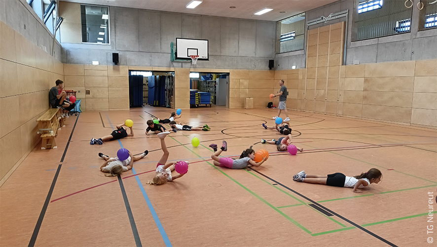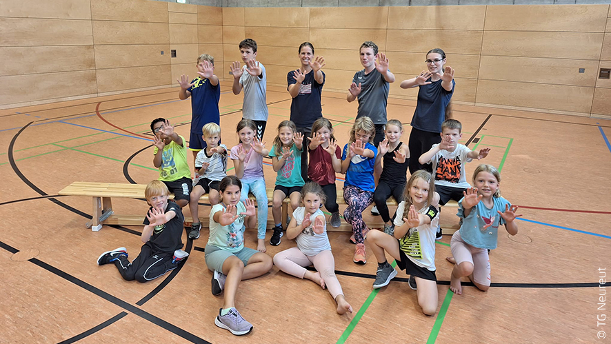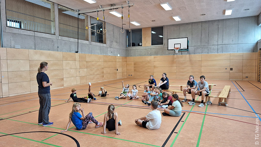 In der ersten und der letzten Sommerferienwoche veranstaltete die TG von Montag bis Freitag erstmals die „Sportwoche“ für Grundschüler*innen. Von 8.30 bis 15 Uhr wurden die Kinder vor Ort betreut. Wobei von 8.30 bis 9 Uhr jedes Kind flexibel in der Turnhalle ankommen durfte. Um 9 Uhr begann dann das eigentliche Programm. Und da ging es abwechslungsreich und vor allem sportlich zu: kleine und große Spiele, Exit Turnhallen Game, Basteln, Bewegungsparcours, Volleyball, Handball, Fußball sowie Selbstverteidigung und -behauptung. An Bewegung mangelte es definitiv nicht.