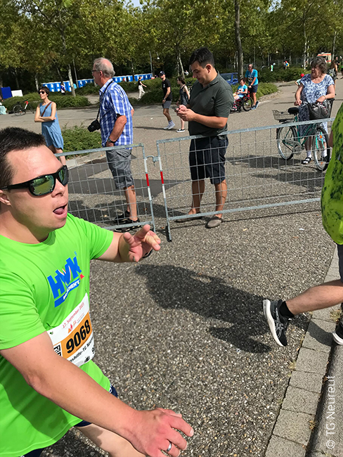 Dieses Mal standen 15 Teams absolut pünktlich um 13.30 Uhr am Start auf dem Schlossplatz. Menschen mit körperlichen, geistigen, seelischen Beeinträchtigungen gingen mit Ihren Lauf-Buddies für die Strecke von knapp 5 km gemeinsam an den Start. Die sogenannten Tandems, bestehend aus unterschiedlichsten Teilnehmenden mit Einschränkungen (Mitgliedern der Lebenshilfe Karlsruhe / Sport und Wohngruppen der HWK) und ihren nichtbehinderten Laufbegleiter*Innen u.a der TG Neureut, gingen gemeinsam die anstrengende Herausforderung an.