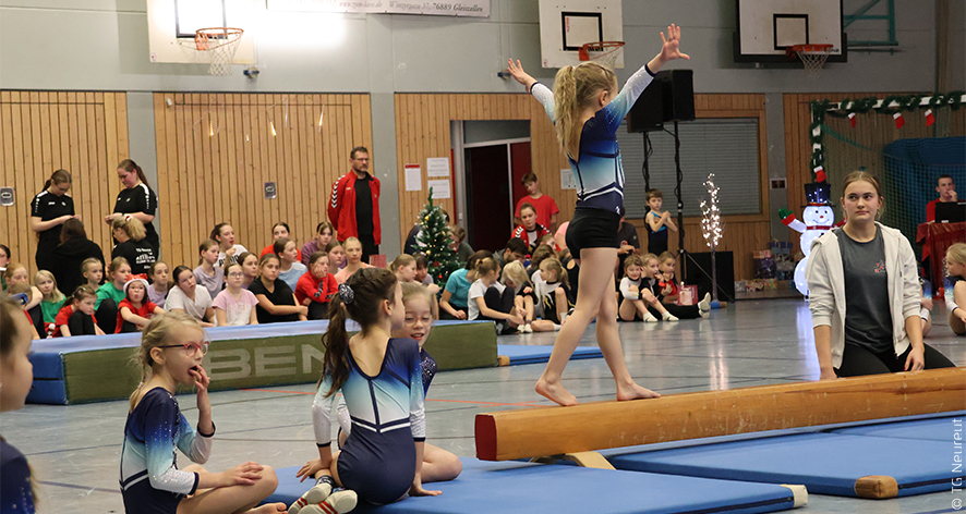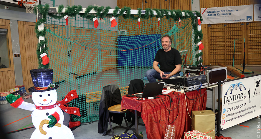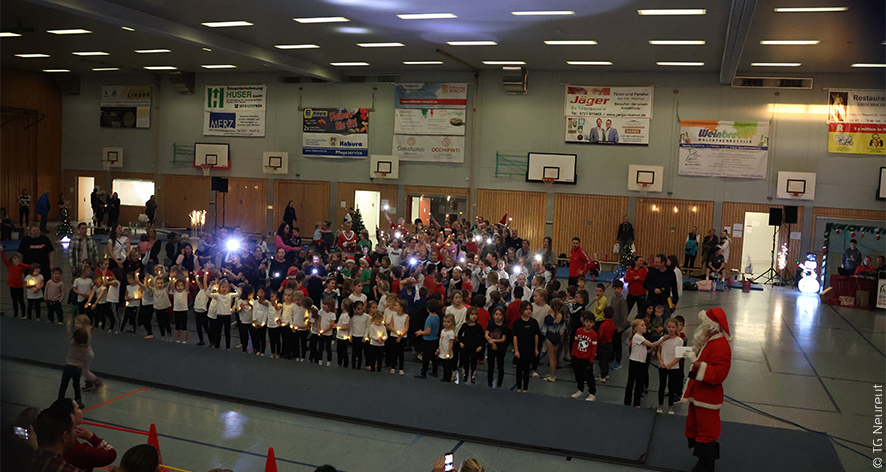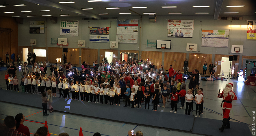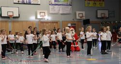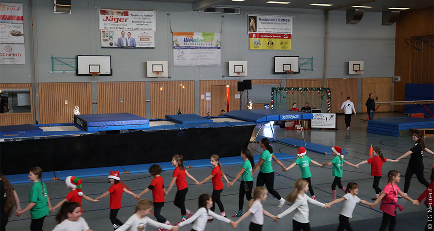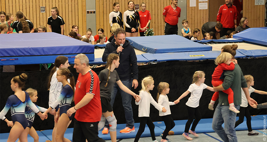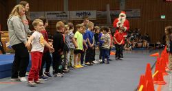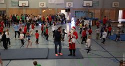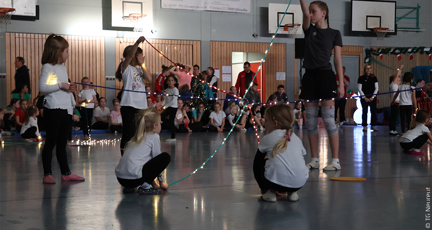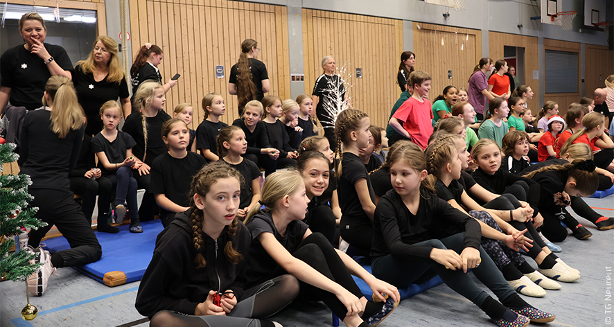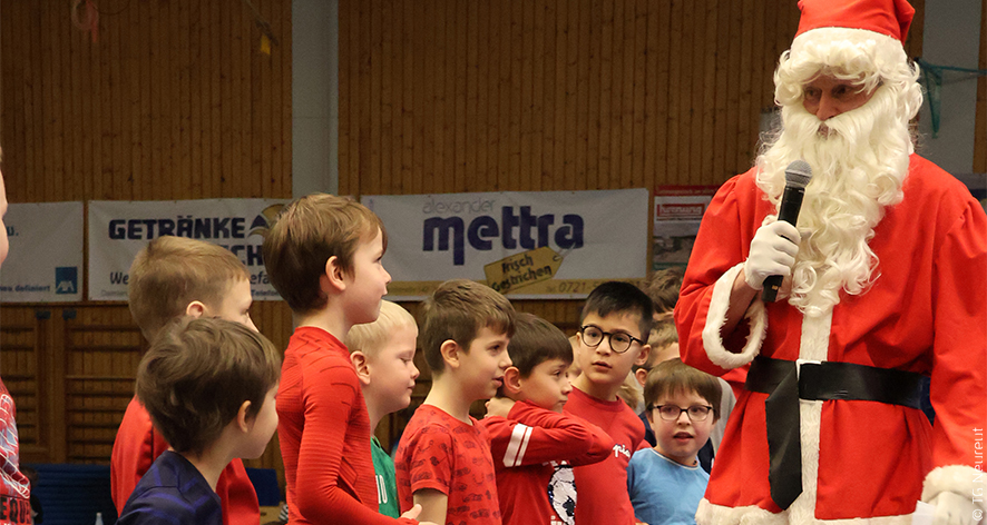 Am 8. Dezember 2024 feierten wir unsere traditionelle Nikolausfeier unter dem Motto „Fun-kelnde Weihnachten“ in der Sporthalle des Schulzentrums Neureut. Bereits am Vormittag erstrahlte die Halle dank festlicher Glitzerdekorationen und viel Engagement im weihnachtlichen Glanz. Pünktlich um 14 Uhr betraten über 300 Kinder gemeinsam mit ihren Übungsleiterinnen und Übungsleitern die Halle, und das bunte Programm konnte beginnen. Natürlich durfte einer nicht fehlen: Unser Nikolaus, der aus der Ferne angereist war, Geschenke im Gepäck hatte und durch das funkelnde Programm führte.