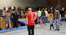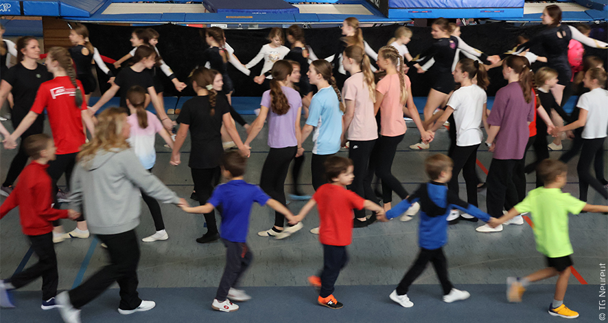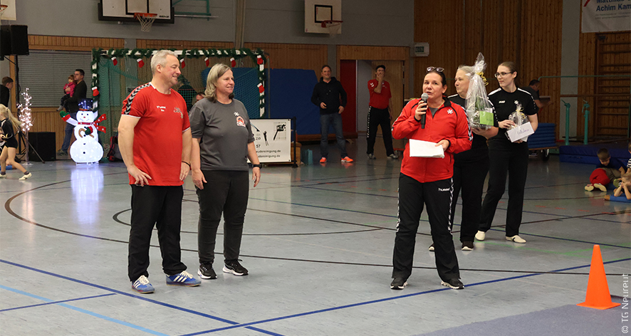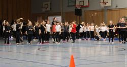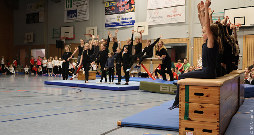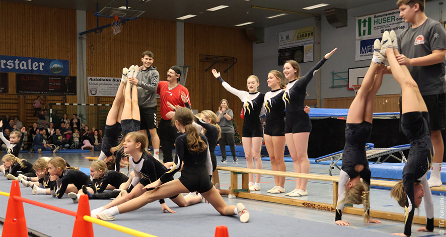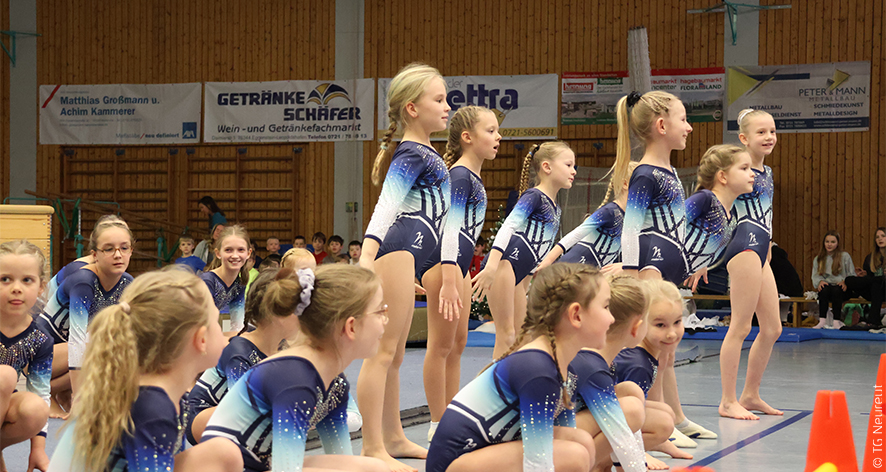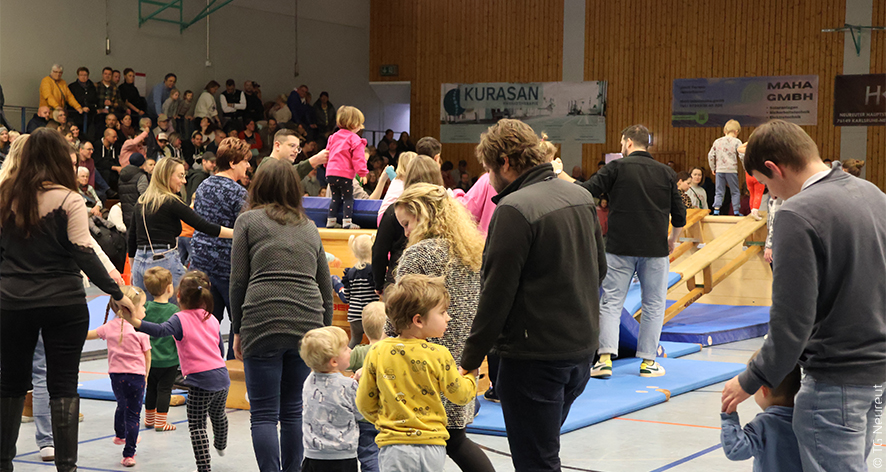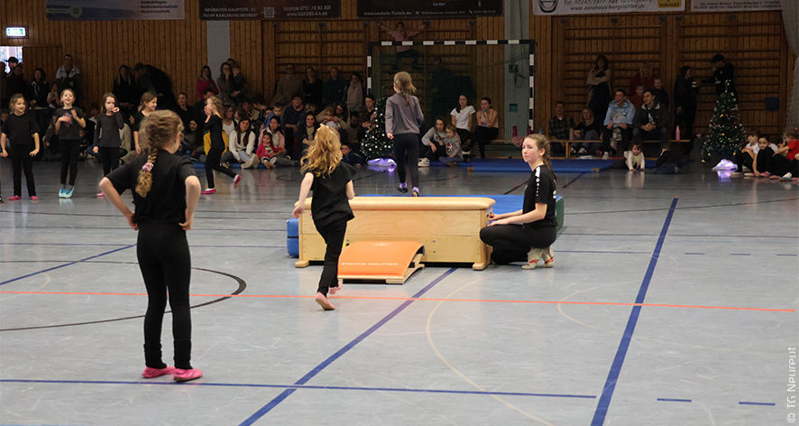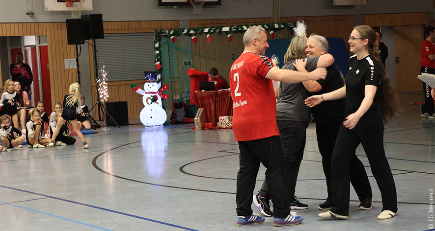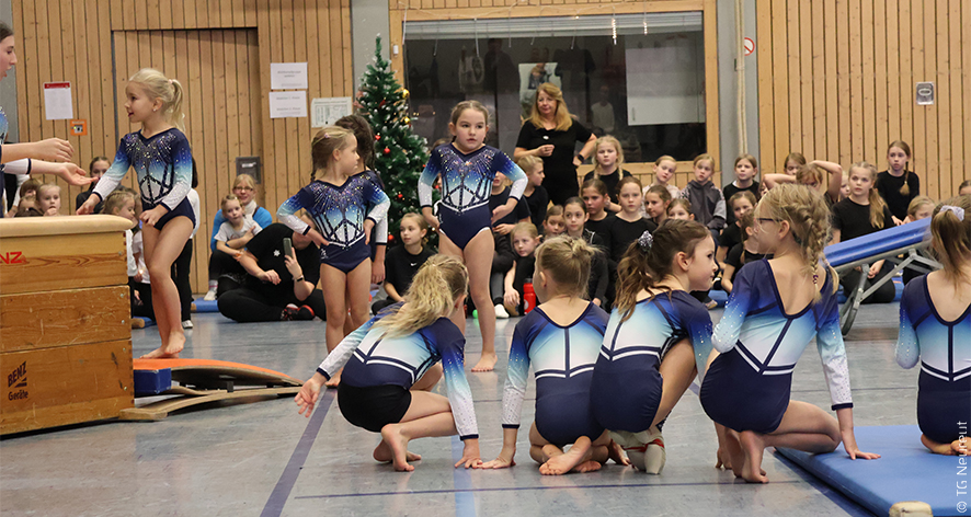 Am 8. Dezember 2024 feierten wir unsere traditionelle Nikolausfeier unter dem Motto „Fun-kelnde Weihnachten“ in der Sporthalle des Schulzentrums Neureut. Bereits am Vormittag erstrahlte die Halle dank festlicher Glitzerdekorationen und viel Engagement im weihnachtlichen Glanz. Pünktlich um 14 Uhr betraten über 300 Kinder gemeinsam mit ihren Übungsleiterinnen und Übungsleitern die Halle, und das bunte Programm konnte beginnen. Natürlich durfte einer nicht fehlen: Unser Nikolaus, der aus der Ferne angereist war, Geschenke im Gepäck hatte und durch das funkelnde Programm führte.