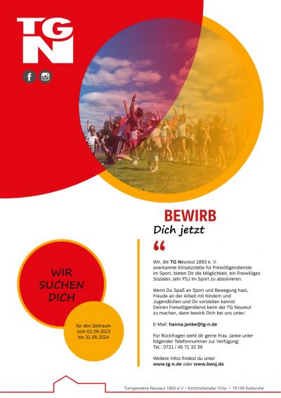 Wir, die TG Neureut 1893 e.V. (anerkannte Einsatzstelle für Freiwilligendienste im Sport), bieten dir die Möglichkeit, ein Freiwilliges Soziales Jahr (FSJ) im Sport zu absolvieren.