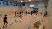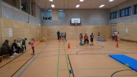 Fünf unterschiedliche Stationen waren in diesem Jahr für den ersten Block vorgesehen. Los ging es mit Übung 1. Hier mussten die Kinder in 30 Sekunden einen Handball so oft wie möglich gegen einen schräg aufgestellten Kasten werfen und wieder fangen. Koordinativ anspruchsvoll wurde es bei der zweiten Station. Die Kinder warfen den Ball in die Luft, berührten mit den Händen abwechselnd die Schultern und klatschen dann noch in in die Hände. Einen Punkt gab es für die korrekte Ausführung und, wenn der Ball zum Schluss auch noch gefangen werden konnte. Um die Schnelligkeit ging es bei den Stationen drei und fünf. Einmal galt es möglichst viele Runden in Seit-, Vor- und Rückwärtsbewegungen um eine Matte zu absolvieren. Das andere Mal sollten die Kinder im Achterlauf um zwei Hütchen sprinten und dabei einen Ball prellen. Treffsicherheit bewiesen die Kinder bei Station vier - möglichst viele Hütchen sollten hier abgeworfen werden.
