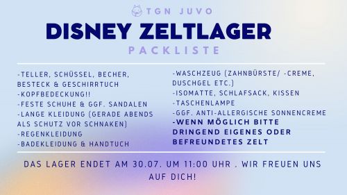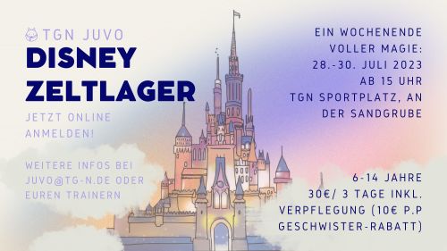 Auf dich warten 3 Tage voller Spaß und coolen Aktionen rund um das Thema Disney. Für Essen und Betreuung ist rund um die Uhr gesorgt. Los geht es am 28.07. um 15.00 Uhr auf dem Sportplatz der TG Neureut (An der Sandgrube, 76149 Karlsruhe). Bring gerne dein eigenes Zelt mit und gib uns Bescheid, mit wem du dein Zelt teilst. Mama und/oder Papa helfen dir beim Auf- und Abbauen. Das Lager endet am 30.07 um 11.00 Uhr.