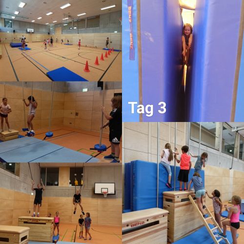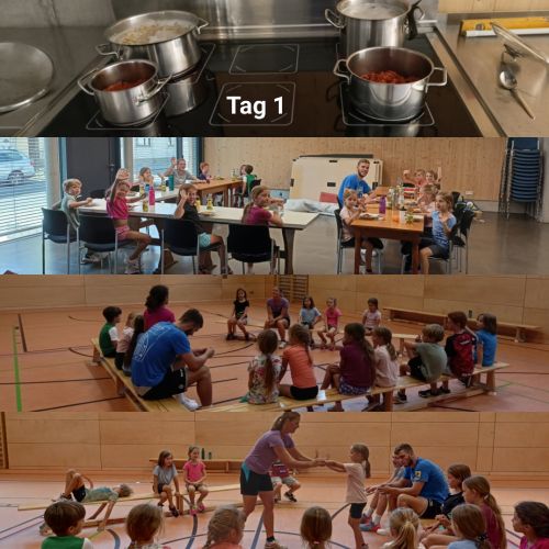 An Tag drei bauten alle zusammen eine riesige Bewegungslandschaft auf. Alle halfen fleißig mit und hatten eine riesige Freude den Geräteraum leer zu räumen. Vor dem Mittagessen wurden noch einige Runden Brennball gespielt.