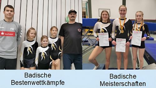 Vormittags wurden die Badischen Bestenkämpfe - der Nachwuchswettbewerb – durchgeführt. In der Klasse 10 Jahre und jünger konnten Linn und Marie saubere Übungen zeigen und belegten Platz 1 und Platz 3. Isabella als Neuling zeigte eine sehr gute Pflicht, aber in der Kür versagten die Nerven – Platz 7.