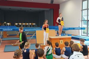 In der Altersklasse 15-17 trat Elenya an und erreichte den 3. Platz. Bei den „Erwachsenen“ ab Jahrgang 2007 zeigte der führende Turner im Vorkampf Nerven, wodurch Charlotte den 1. Platz für sich entscheiden konnte.