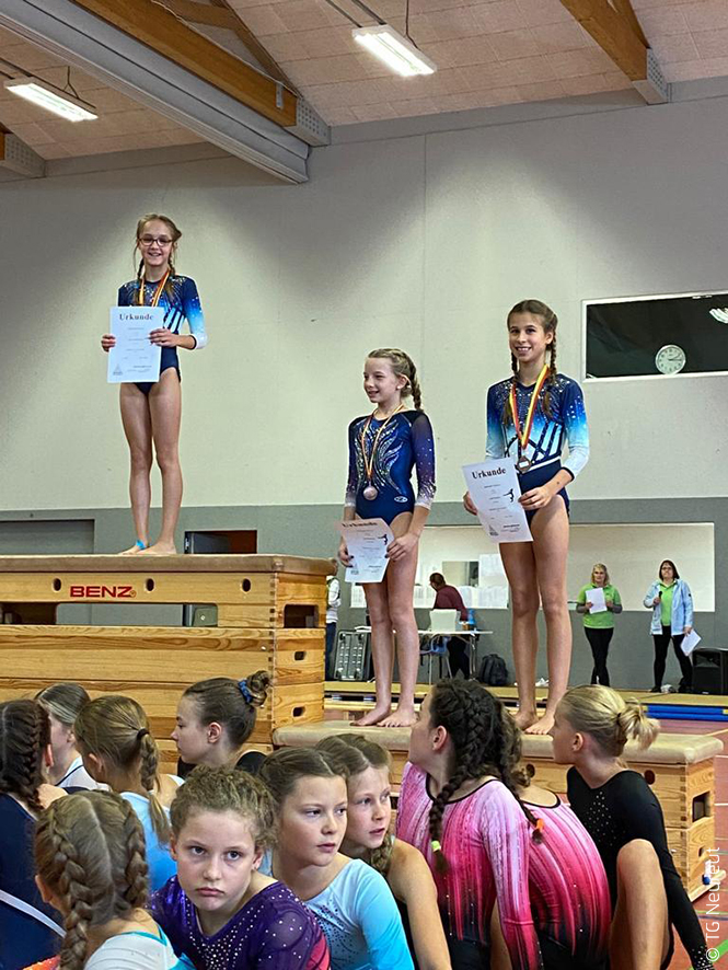 In den Wettkämpfen am Nachmittag steigerten sich die Anforderungen und neben der LK4 waren nun auch die Leistungsklassen LK3 und LK2 zu sehen. Martha wurde in der LK4 mit einem 3. Platz belohnt. Lene und Laura turnten in der LK2 und belegten die Plätze 2 und 3. Ebenfalls in der LK2 erturnte sich Maja den 3. Platz.